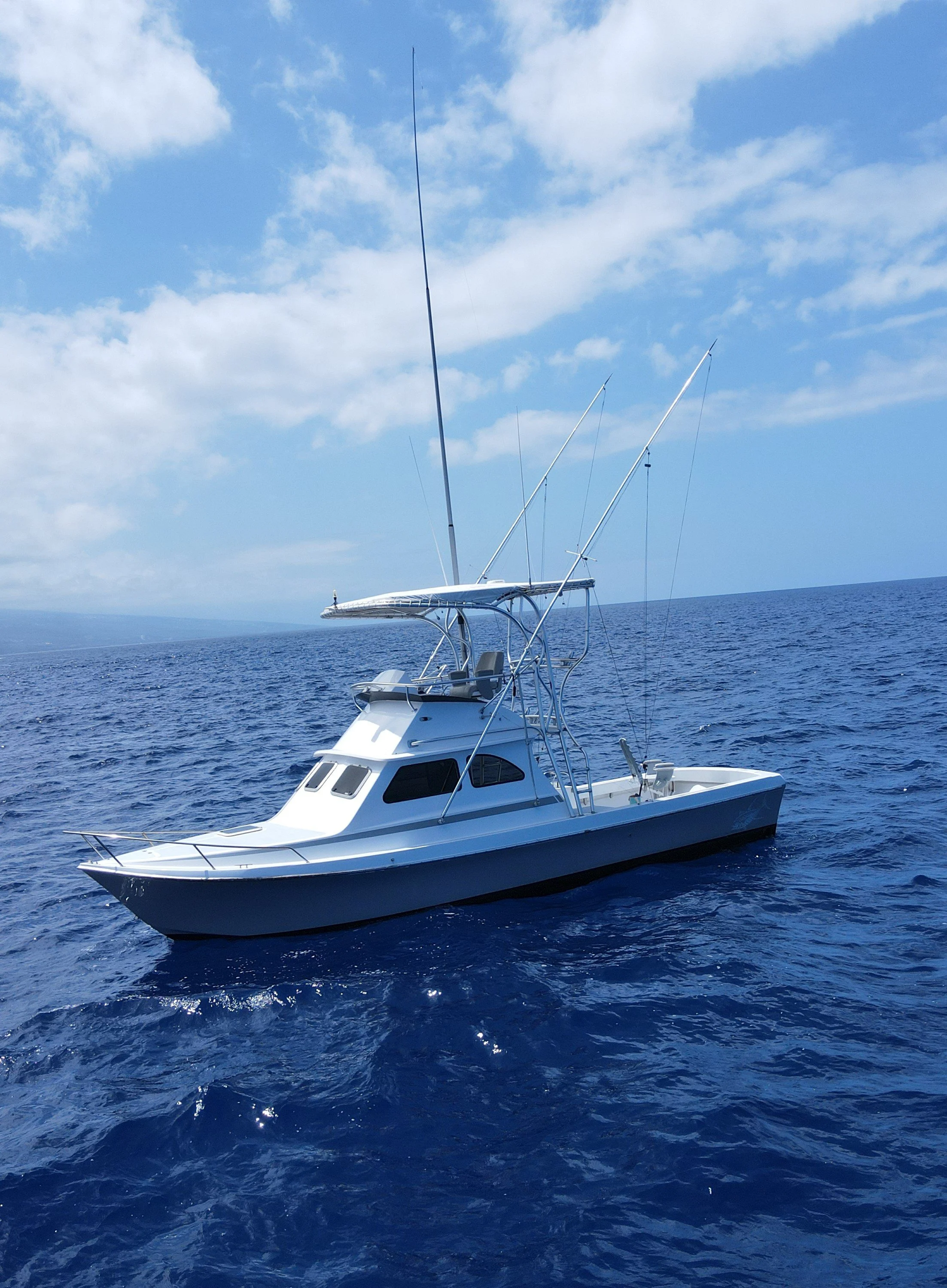 The Lepika is a custom 33’ Force built locally in Hilo, Hawaii. It’s built for rough water which makes it one of smoothest riding boats in Kona’s calm waters. Powered by twin Cummins Marine 6BTA 315hp engines she is fast, quiet and most of all free of smelly diesel fumes. Her open design has plenty of shade and lounge style cushioned seating. She’s equipped with state of art Garmin electronics and Simrad SY50 Omni sonar (see Omni Sonar page). Our tackle selection includes Shimano reels and top of the line Ian Miller custom rods. The Lepika is also equipped with a Hamaguchi Greenstick for targeting large yellowfin tuna. Most importantly she has a full size toilet onboard!